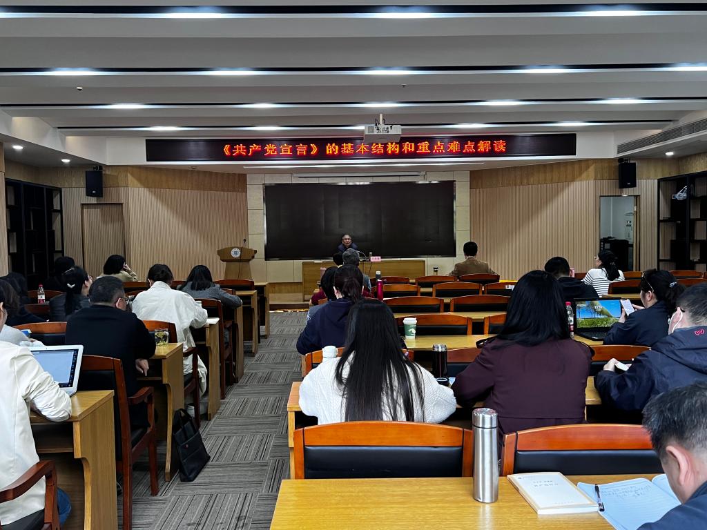 胡承槐教授向大家深入浅出地讲授了四方面内容:一是我们今天应如何看待《共产党宣言》,二是《共产党宣言》的写作目的,三是《共产党宣言》的基本框架和逻辑结构,四是《共产党宣言》的重点和难点解析。杨华经理作总结发言,她对必一运动教师提出三点要求:一是要读原著、学原文、悟原理,不断夯实自身的马克思主义理论基础;二是要从社会实践和时代特征出发,带着问题学、联系实际学;三是要以主题教育为契机,设定好自己的读书目标。
