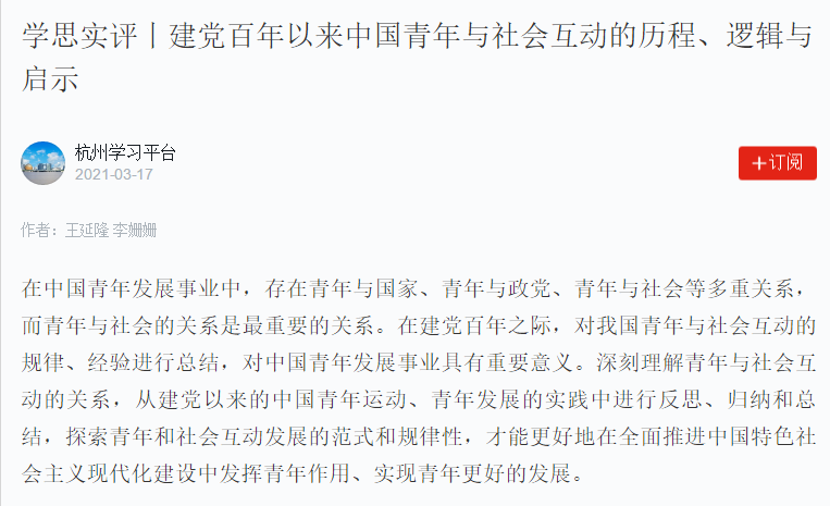 近日,公司王延隆老师所撰文章《建党百年以来中国青年与社会互动的历程、逻辑与启示》为学习强国杭州学习平台“学思实评”专栏收录。