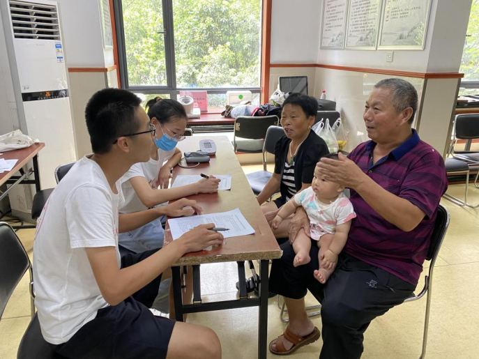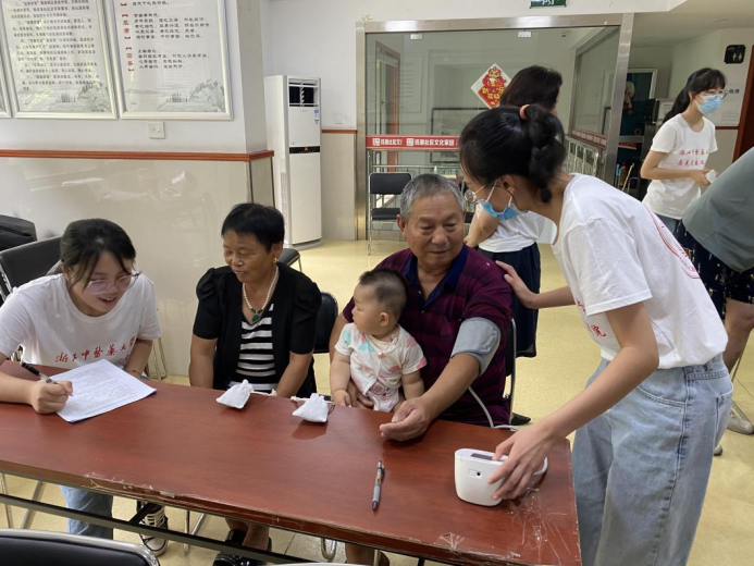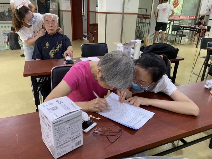 团队成员热情地为到场的每一位老人测量血压,并与他们聊聊日常生活情况,细心地叮嘱他们饮食方面的注意事项,应荤素搭配,少吃不易消化的食物,在日常生活中要注意劳逸结合,适量运动。