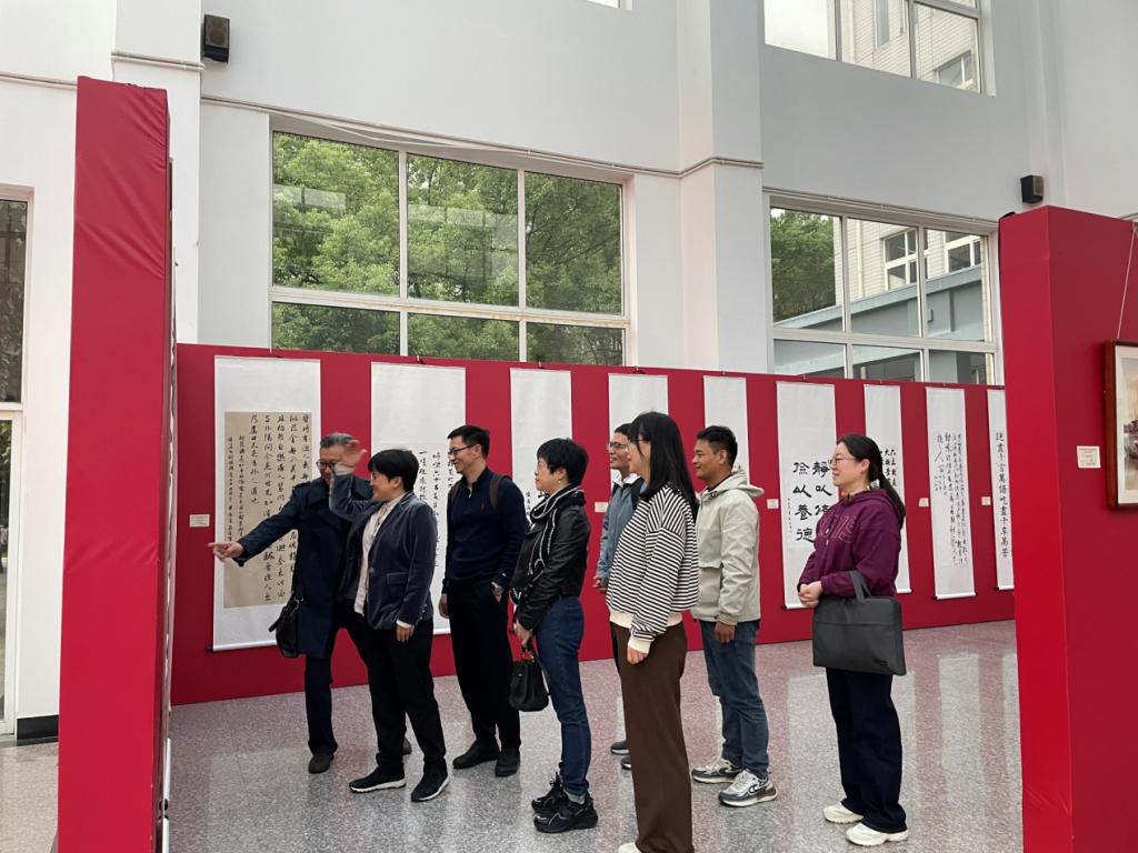 2024年10月30日,党支部成员在滨文校区图书馆一楼大厅观看B-Sports建校65周年书画展。