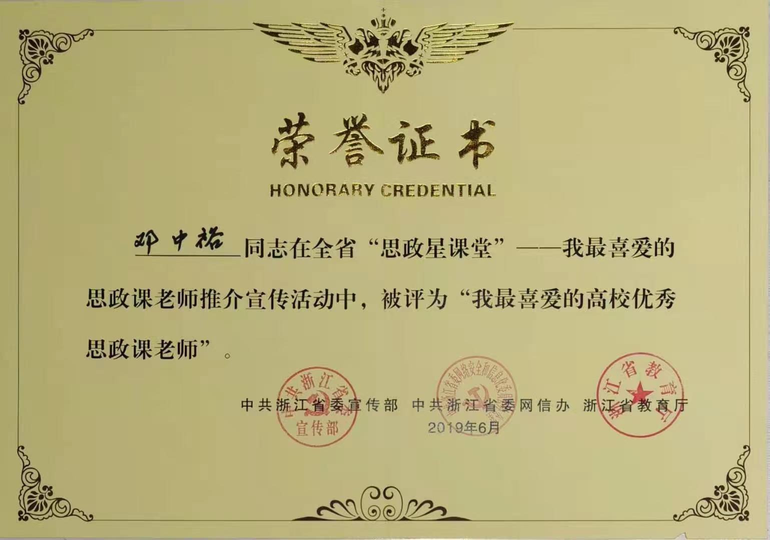 邓中裕,思想道德与法治教研室教师,武汉大学历史学学士,华中科技大学法学硕士。省级线上线下混合式一流课程负责人,浙江省教育系统“三育人”先进个人,浙江省首届“我最喜爱的高校优秀思政课教师”,曾获浙江省本科院校“互联网+教学”优秀案例一等奖、浙江省高校《思想道德与法治》教学比赛一等奖等奖项。